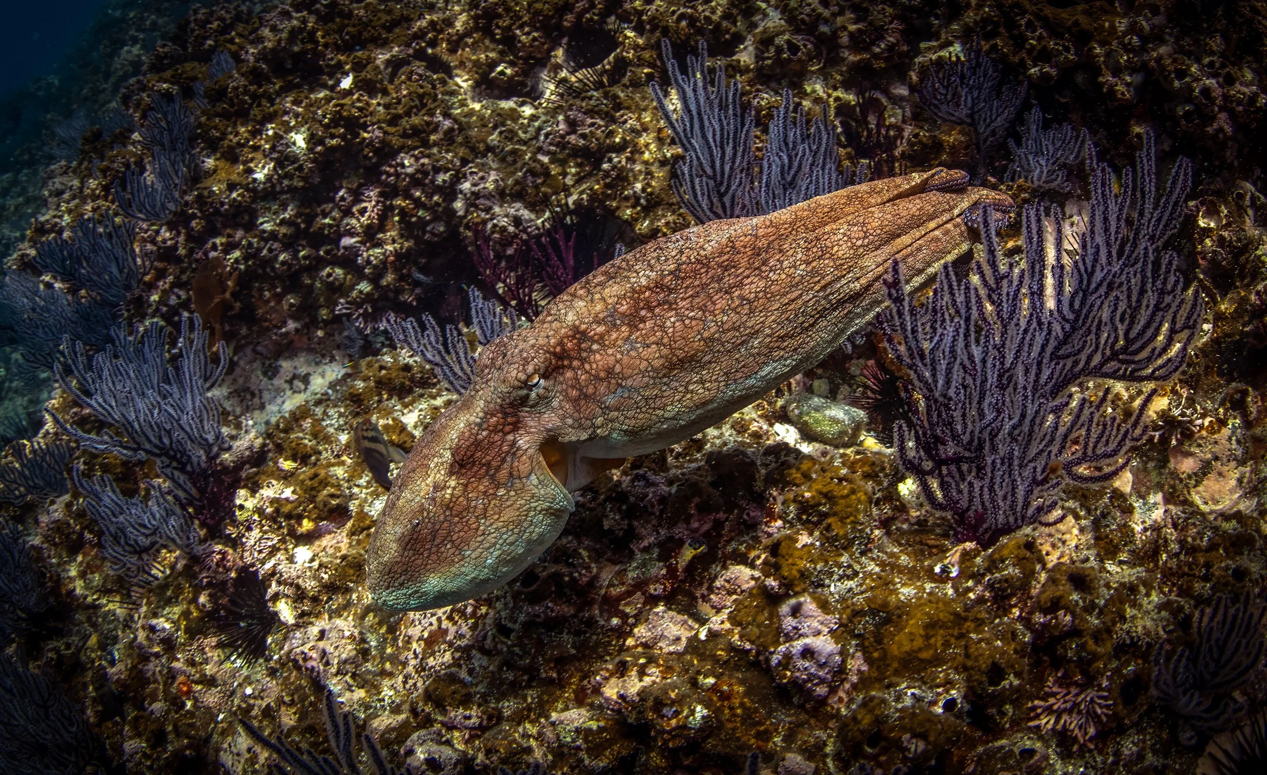 In the shallows, I found an octopus and spent some time photographing it. At first it was shy, doing its best rock impression, but eventually it relaxed and began crawling across the reef. I wanted some swimming shots of the octopus.