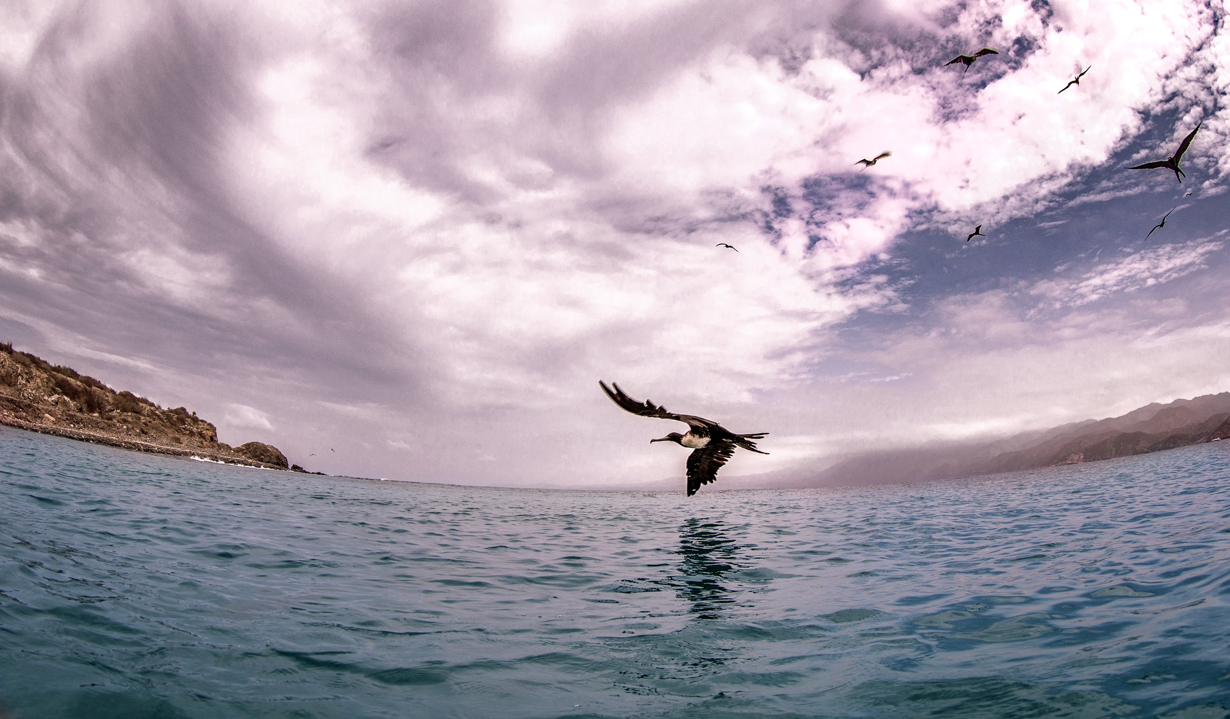 Above us, magnificent frigatebirds circled like giant pterodactyls, taking full advantage of the chaos. They swooped down to steal scraps right off the surface, barely missing the water as they snatched their prize.