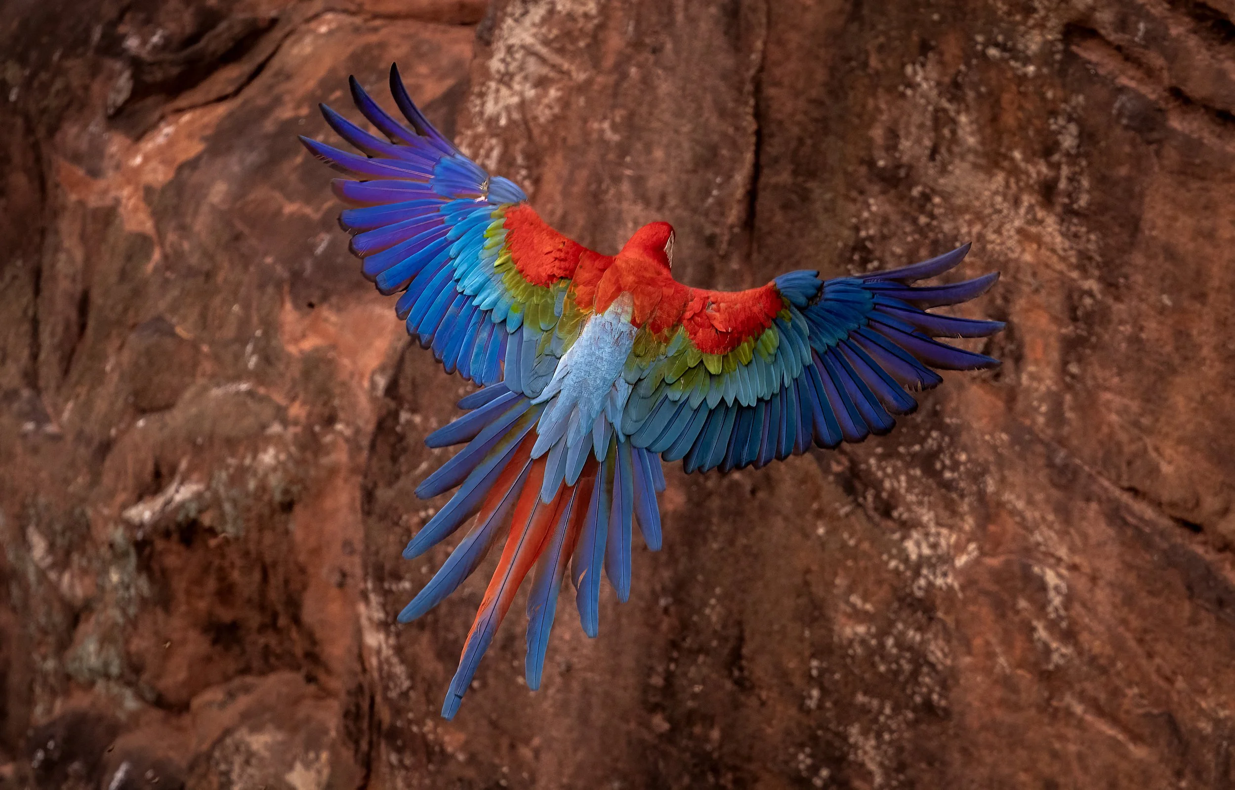 I captured this image just as a macaw was about to land on a rock. Its wings opened wide, braking for landing, colors fully exposed. It was a challenging shot to pull off, but moments like this make the work worth it.