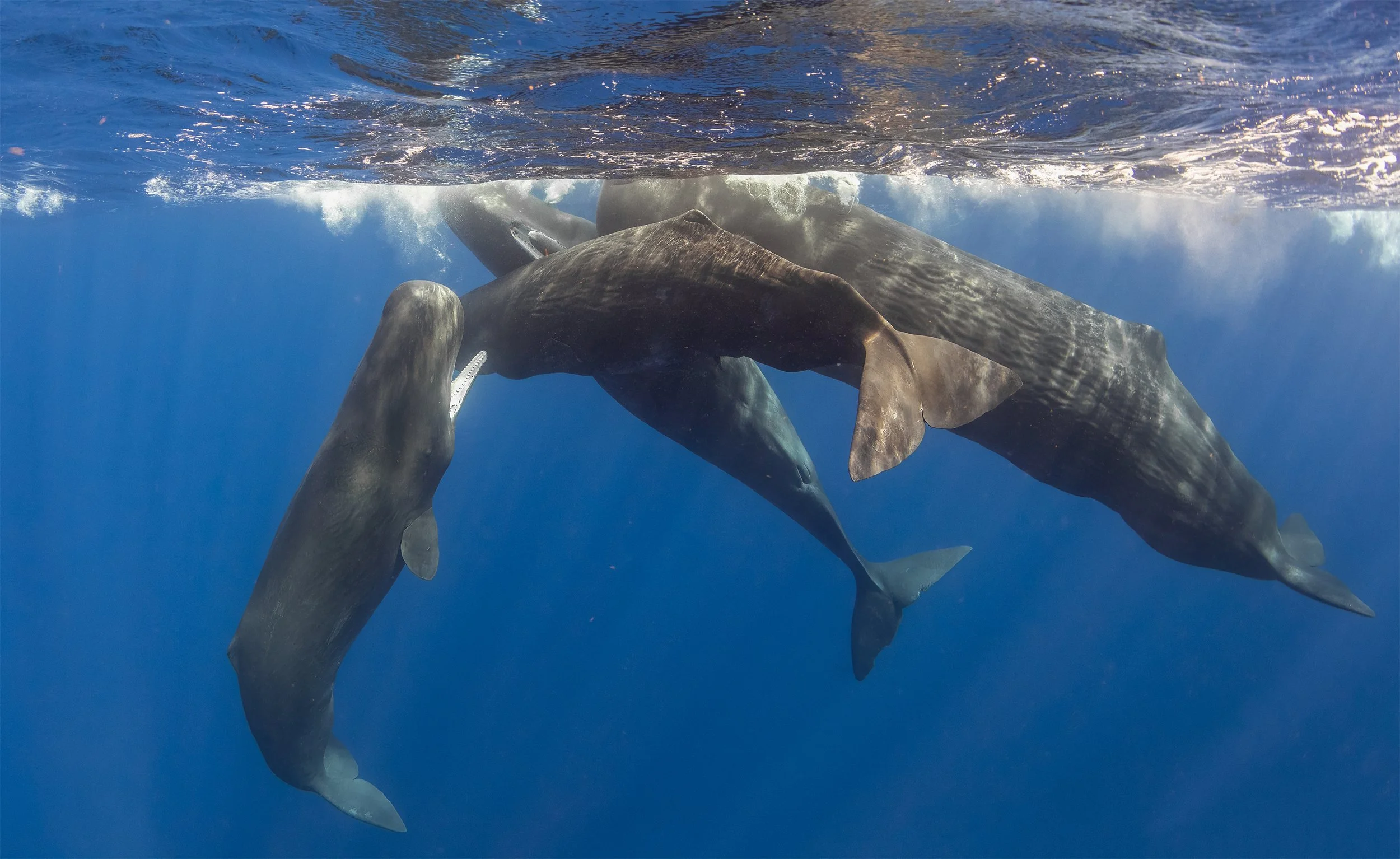 Most of the whales eventually dropped down or moved off, except for four that turned back toward us and began rolling and playing.