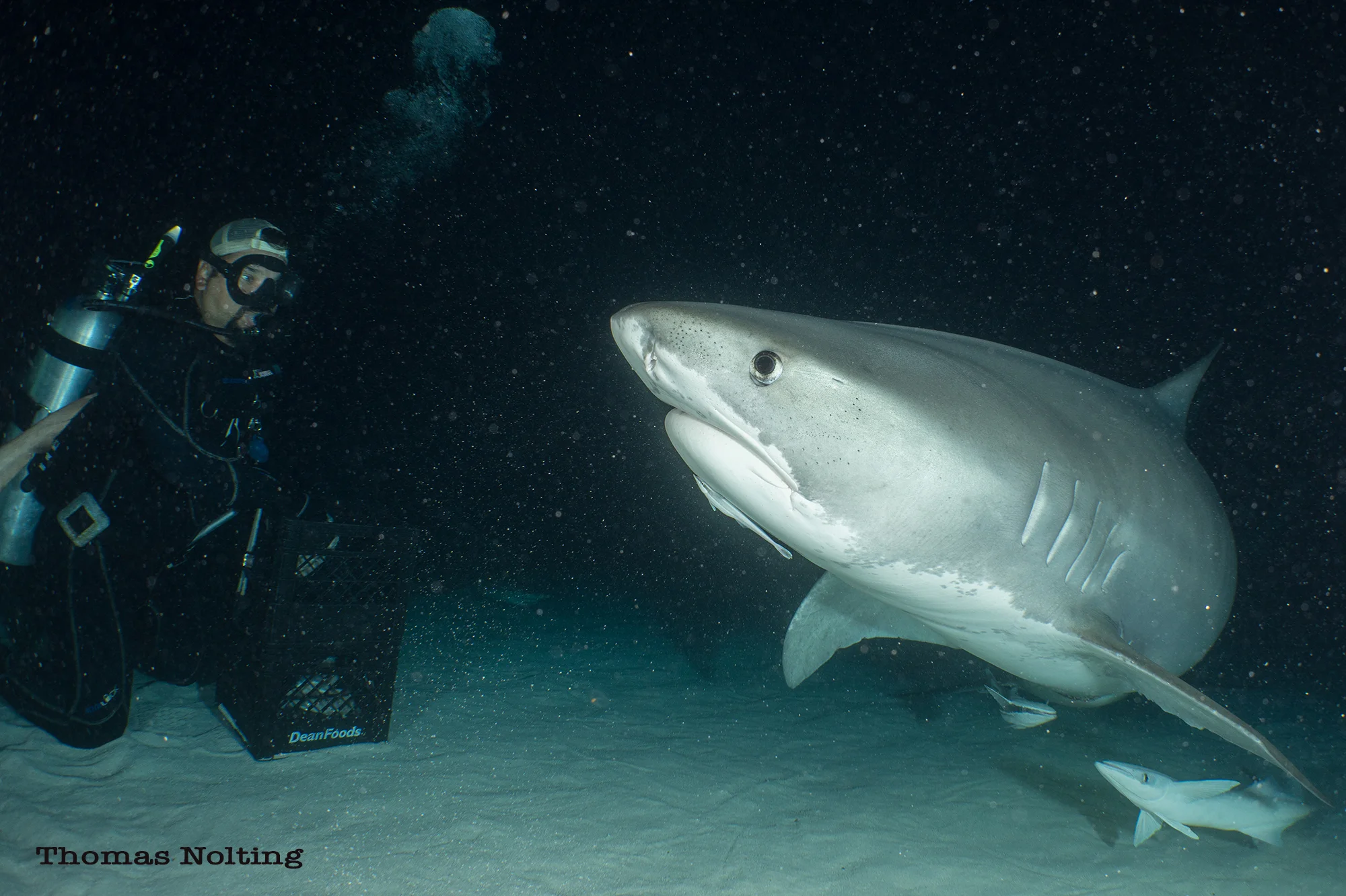 During our night dive, it took about 25 minutes before the tiger came in. We were just about to call the dive, when I spotted this massive shape of a tiger in the darkness. It was Jenn. A 13 foot, 1,200 Lb. tiger shark. Everyone got excited and I got back into position to wait for Jenn to come in. It took a while before she did, she was nervous with all the lights and the lemons swimming all over the place. It took about 10 minutes before she relaxed enough to come in, but when she finally did... it was game on. She is a big shark, but damn, does she look huge at night!
